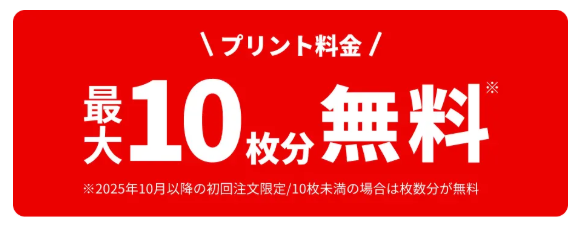 - 対象:印刷料金(写真仕上げ・印刷仕上げ)+10枚無料(初回注文分に限る)