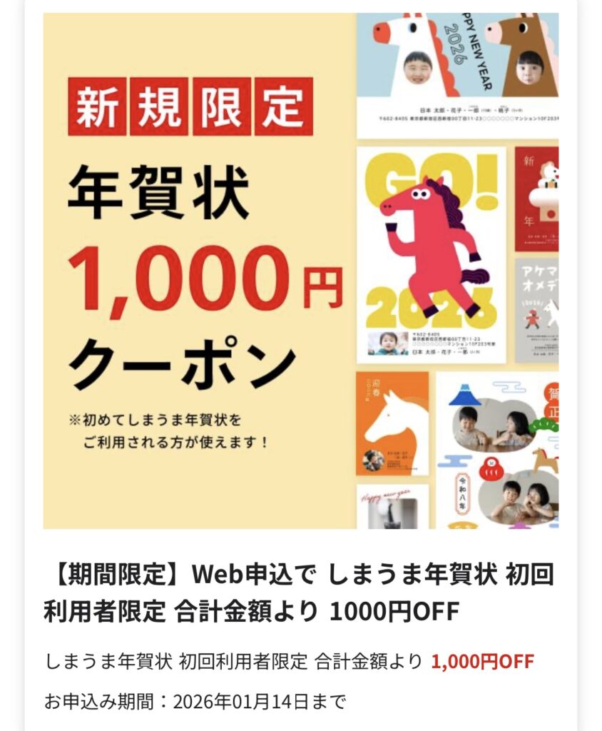 「しまうまプリント」「しまうまフォトブック」で注文した方の場合、「しまうま年賀状」で使用できるクーポンが発行されているケースもあるようです。